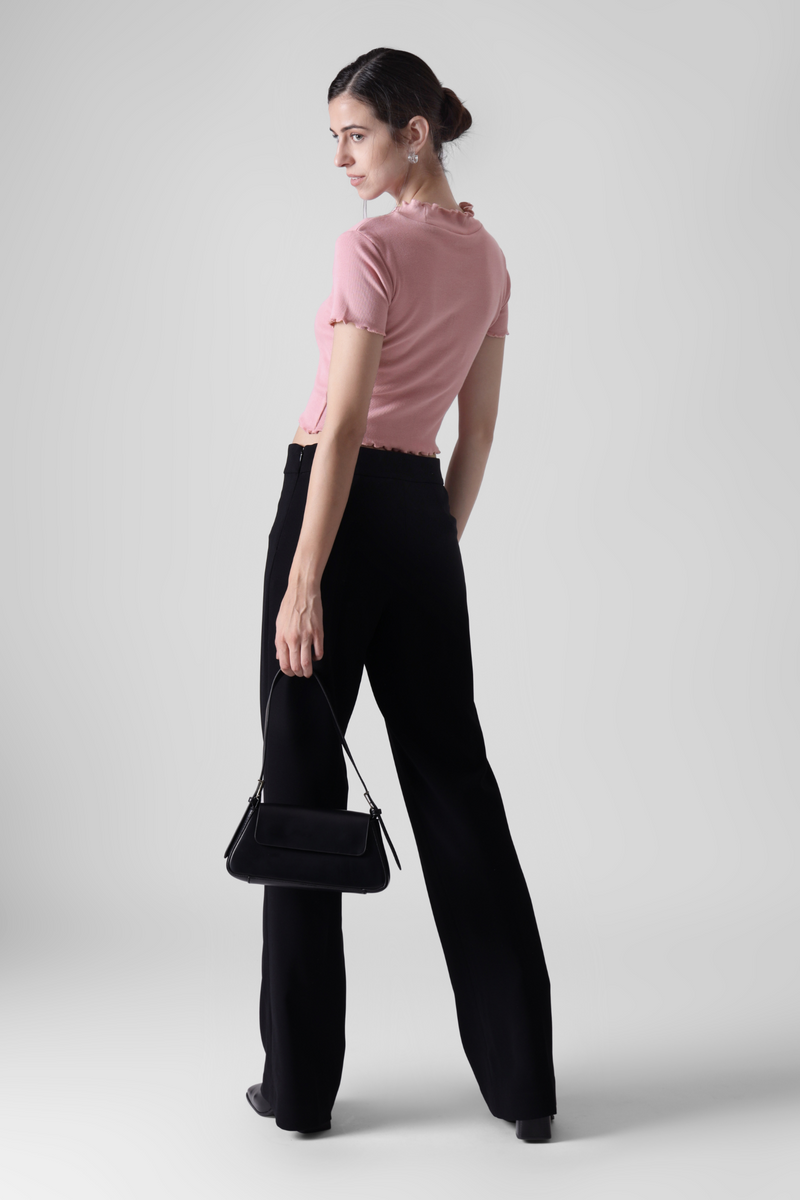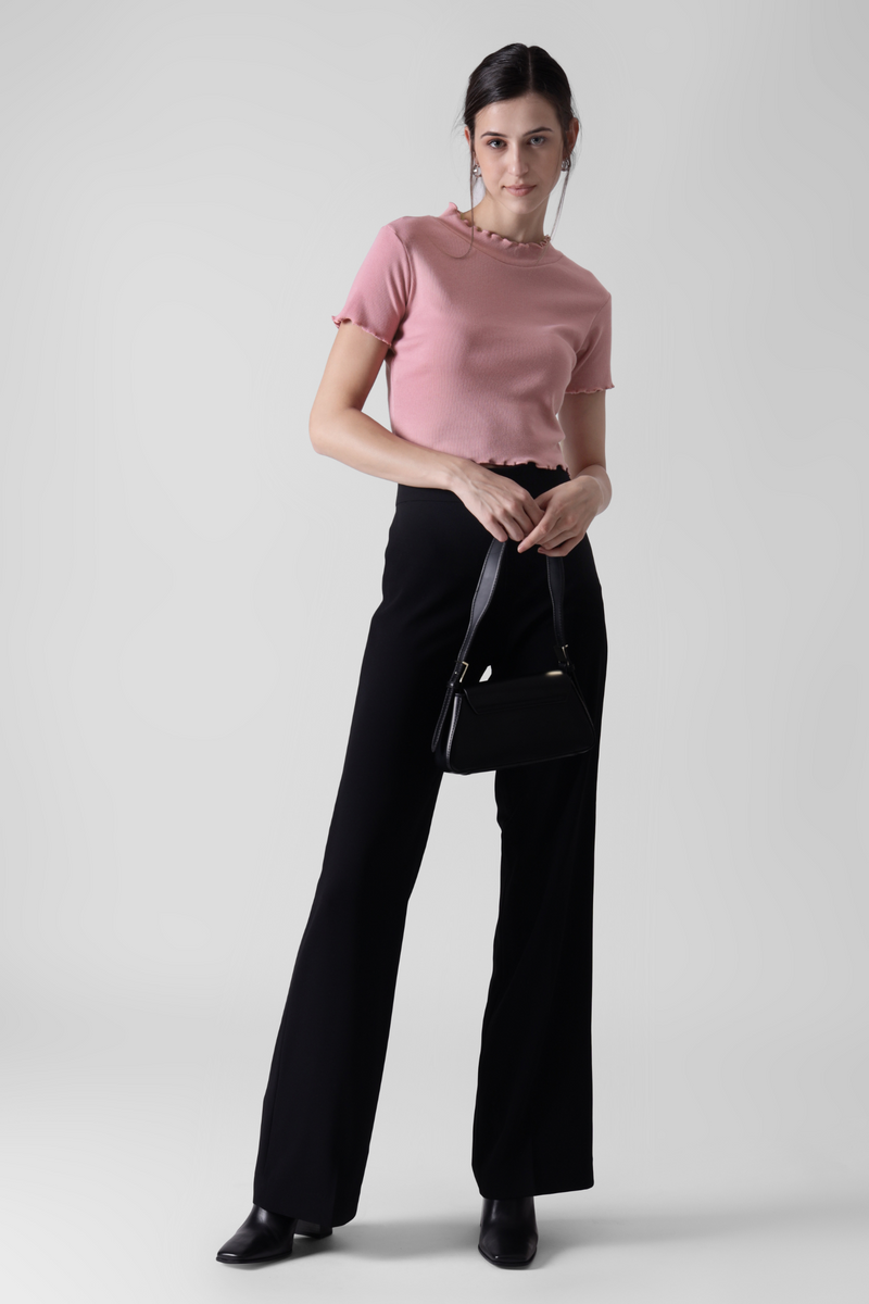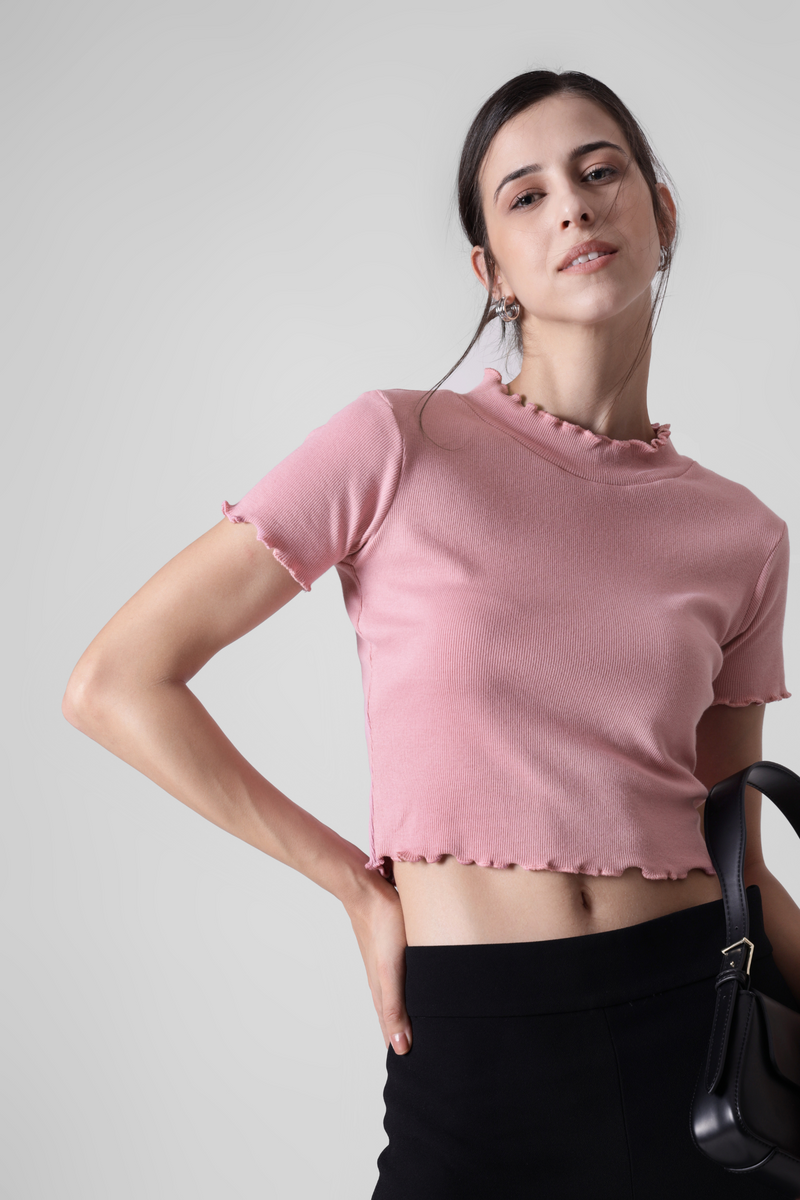 Salmon Pink- Lettuce trim Ribbed crop tee